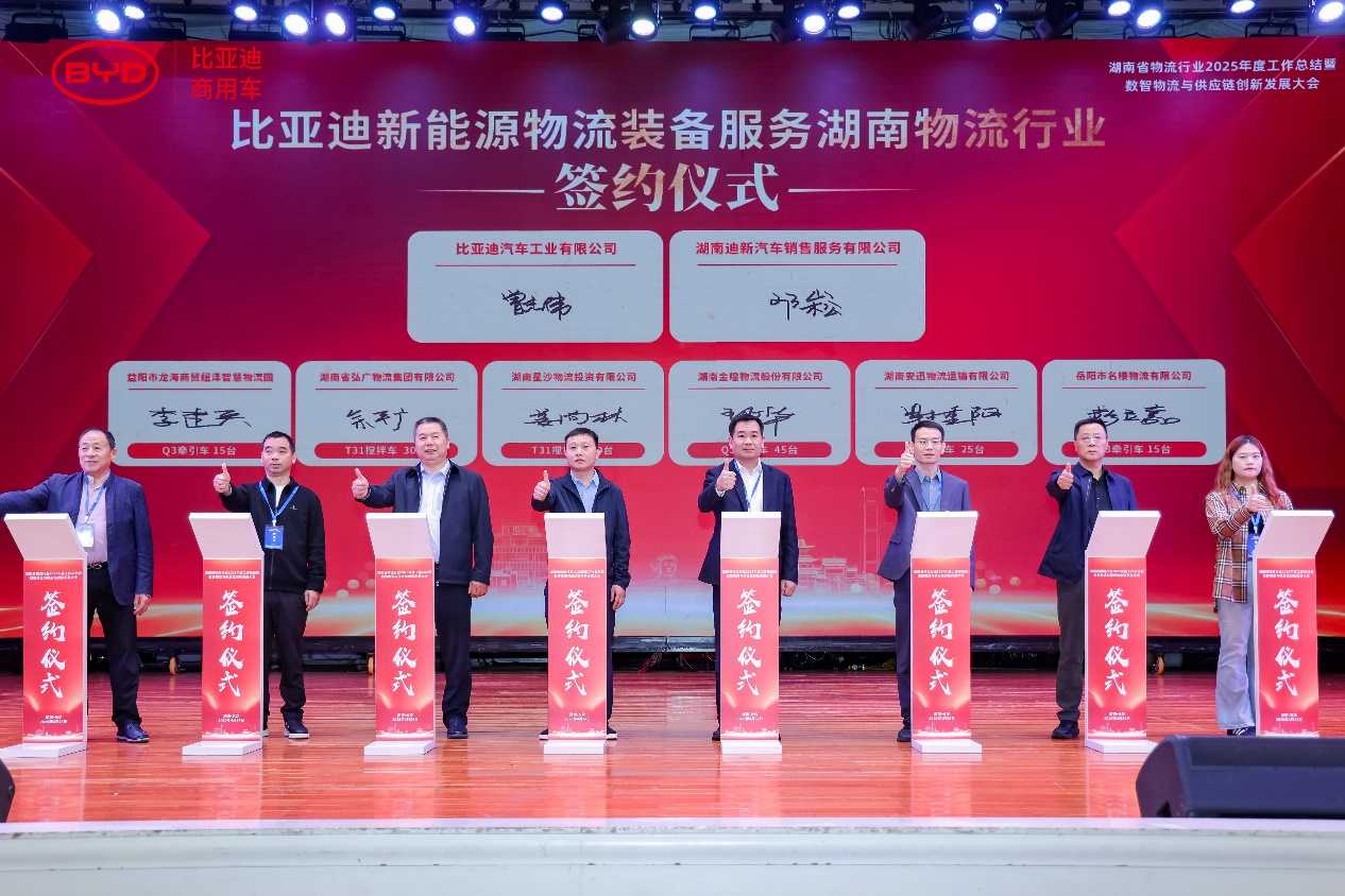 4月24日,湖南省物流行业2025年度工作总结暨数智物流与供应链创新发展大会在长沙举行。比亚迪商用车携纯电牵引车Q3、纯电动自卸车T31重磅亮相,现场达成150台新能源重卡战略签约,以全场景绿色运力方案,助力湖南物流行业低碳高效转型。